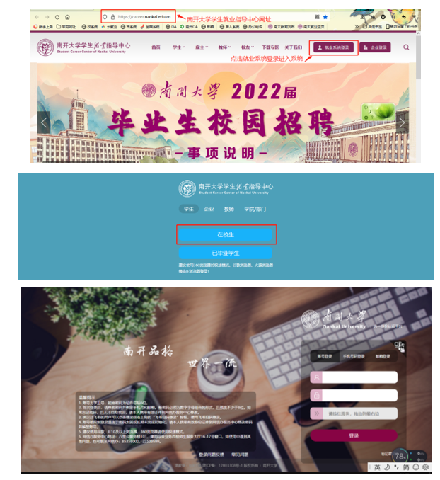 员工打开浏览器输入永利yl23411员工就业指导中心网址:https://career.nankai.edu.cn/,点击“就业系统登录”,选择“在校生”通过统一身份认证登录进入系统。如下图所示: