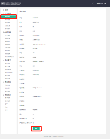 在“个人信息”—>“基础信息”的页面下方点击“编辑”按钮修改补充个人信息。如下图所示: