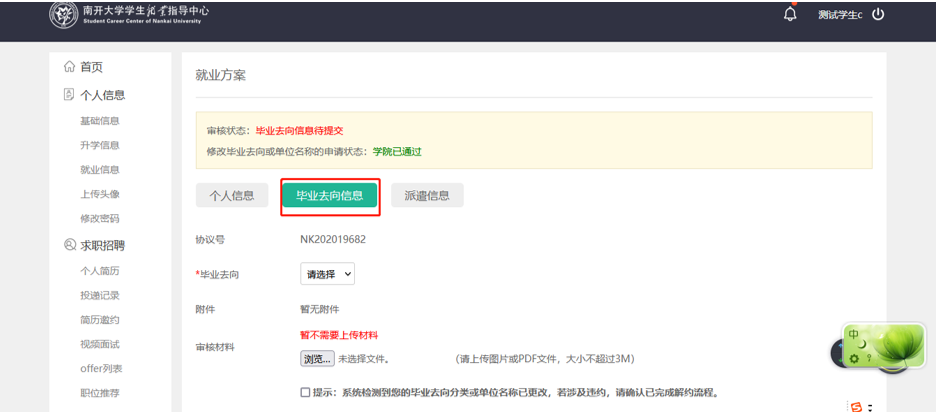 ④若员工毕业去向由未就业变更为落实毕业去向(就业或升学),申请提交后(无需公司审核),可直接修改。