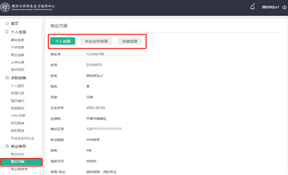 “就业方案”模块在左侧功能栏,由个人信息、毕业去向信息和派遣信息三部分组成。