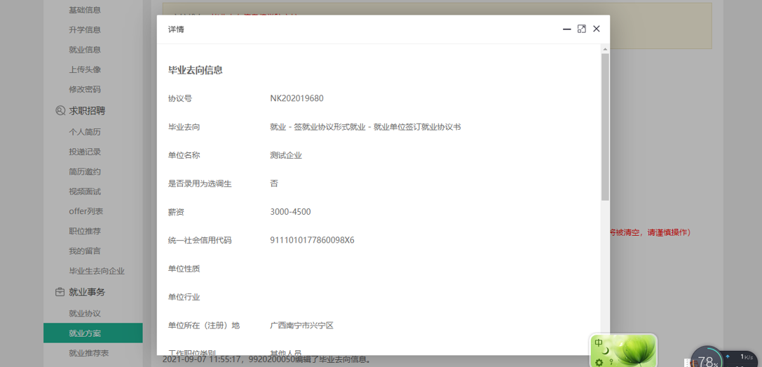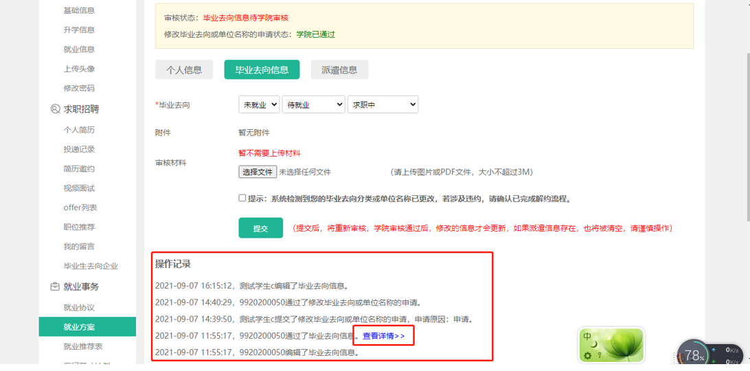 注:员工可从审核记录里查看填写的就业方案(毕业去向信息和派遣信息)历史信息,如下图所示: