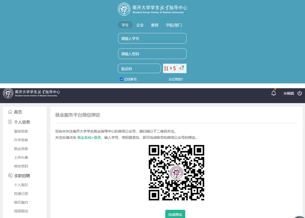 初次登录就业系统的员工请先关注永利yl23411员工就业指导中心的微信公众号后请点击“就业系统”—>“登录”,登录后即可完成账号和微信公众号的绑定。点击“完成绑定”进入系统操作界面。