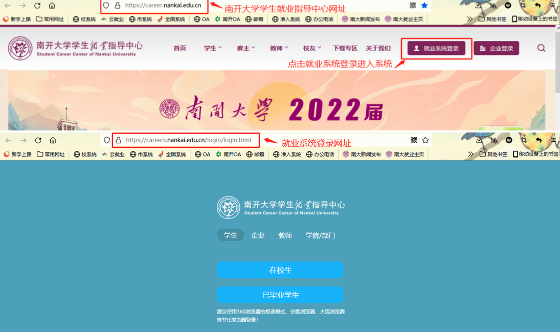 打开浏览器(为避免出现系统不兼容部分功能无法正常操作的情况,请使用360浏览器的极速模式、谷歌浏览器、火狐浏览器等非IE浏览器),输入永利yl23411员工就业指导中心网址:https://career.nankai.edu.cn/,点击就业系统登录或就业系统登录网址:https://careers.nankai.edu.cn/login/login.html进入登录界面。如下图所示: