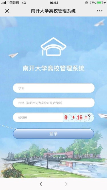 搜索并关注微信公众号“南开微学工”,进入公众号后点击底部专栏“事务办理”,在界面中找到“离校申请”并点击进入,登陆账号为学号,密码为身份证号/其他证件号后六位,身份证号最后一位为X的同学,为大写X,登入后点击“离校申请”。