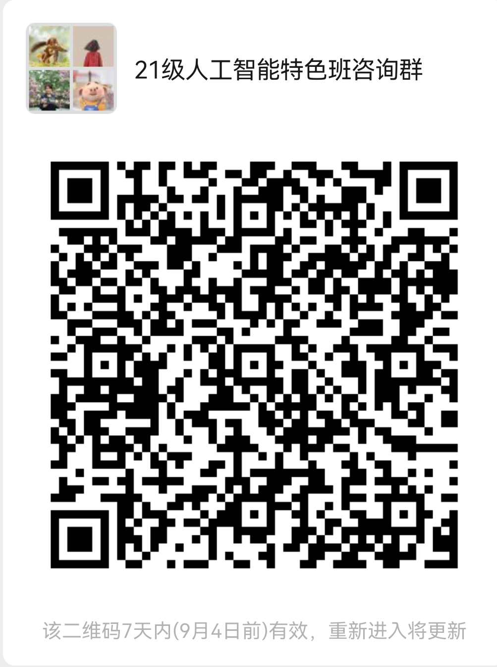 欢迎21级新生加入“21级人工智能特色班咨询群”,打开微信扫描二维码: