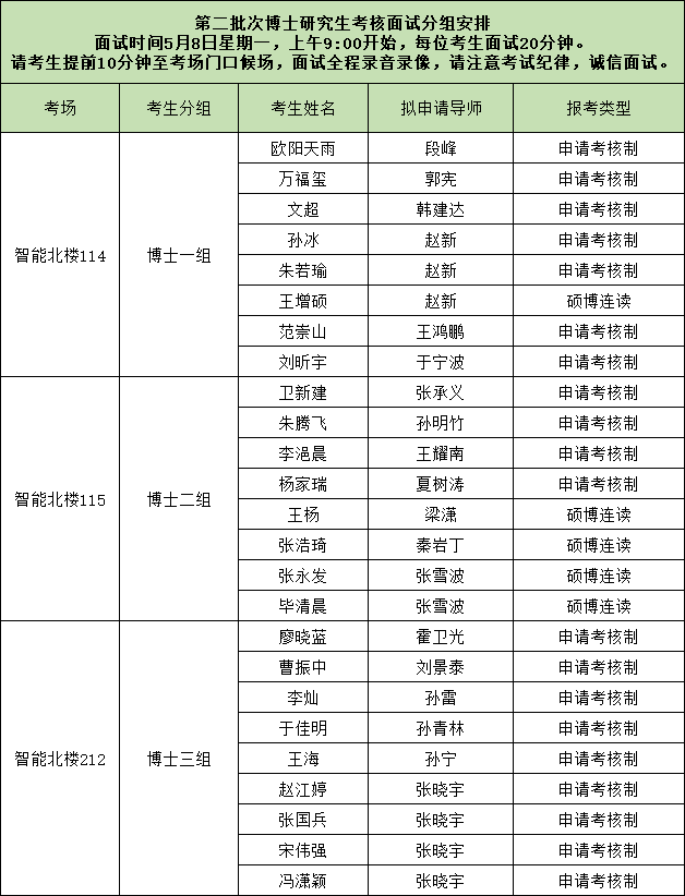 第二批次博士面试将在5月8日开展,请查看自己的分组情况,按时参加现场面试。考生需准备8-10分钟PPT用于自我介绍,可准备简历发放给在场面试教师。进校方式等详见考生飞书群通知。